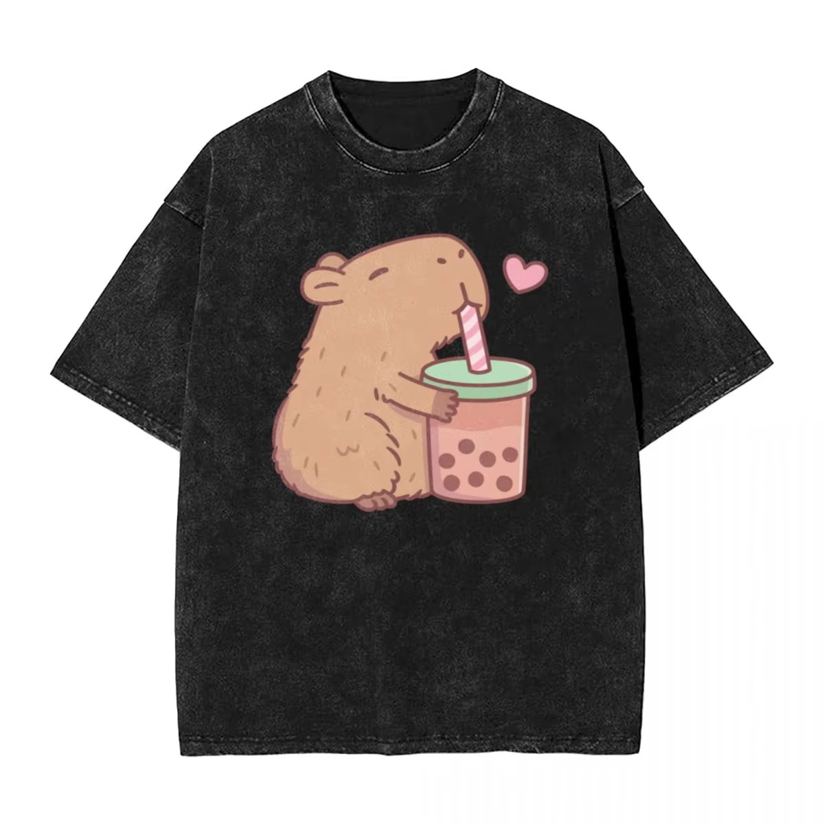 The oversized tee acts as a playful addition to casual outfits and has an oversized design of a capybara drinking bubble tea. It’s an anime vintage style shirt with great figures plus unique design and great boldness to add to a casual outfit.