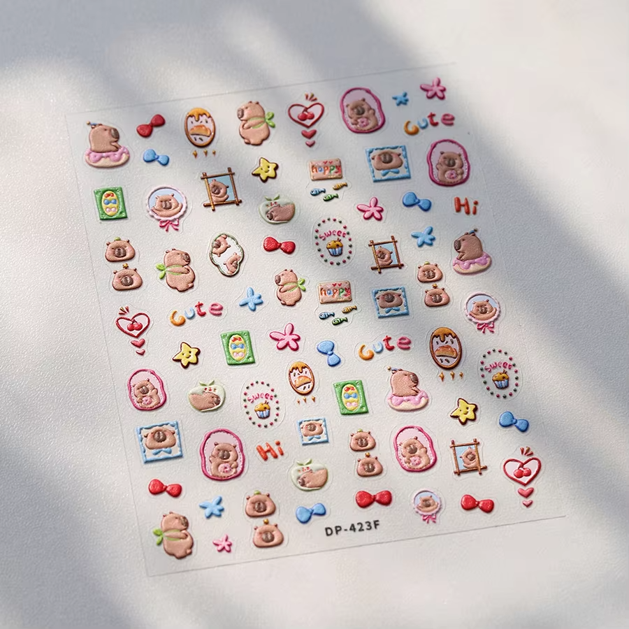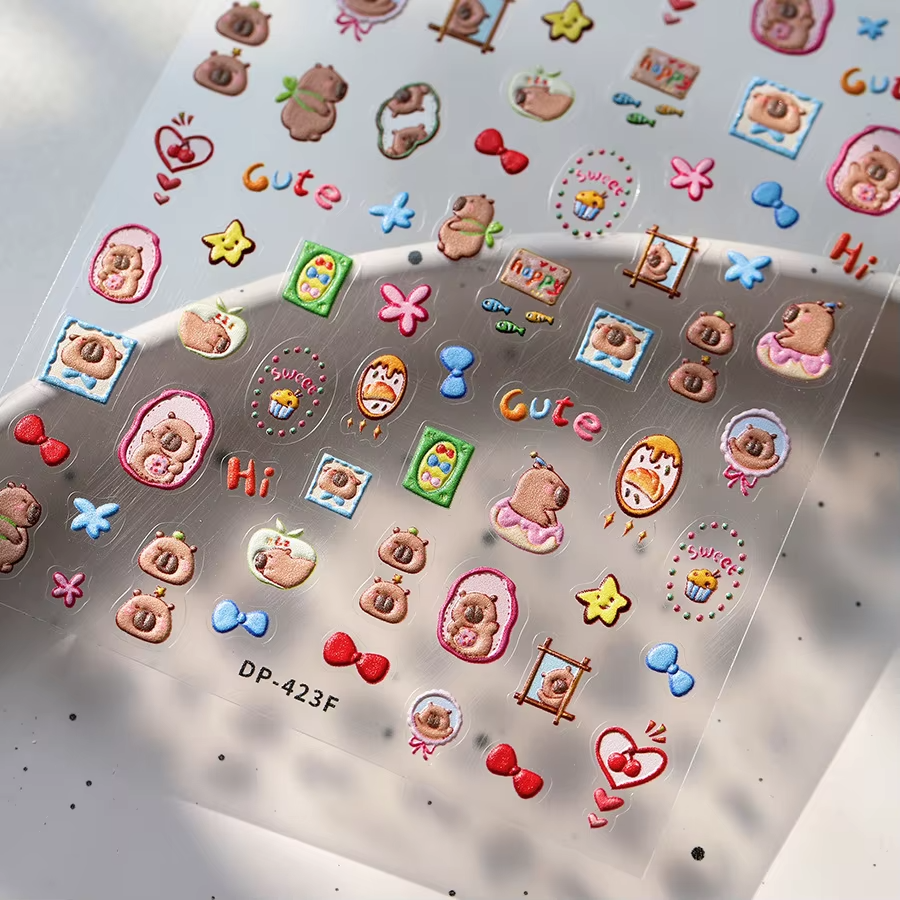This collection of stickers includes cute hamster 3D Deco Decals and 5D Soft-Embossed Relieve Adorable Capybara Cartoon Doodle Nail Art. It allow their user to elevate and transform their nail art. Available for bulk purchase to nail salons, beauty professionals, and DIY enthusiasts, these stickers will stand out and are unique. Combining whimsical animal designs with advanced 3D embossed technology, these decals offer a textured, bold finish to any manicure.