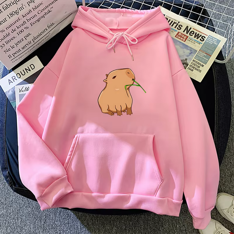The soft, harajuku-style hoodie features an adorable cartoon capybara design, and is perfect for anyone looking to elevate their streetwear! This Funny Capybara Hoodie is great for all genders, and for anyone who loves cute animals and fun clothing.