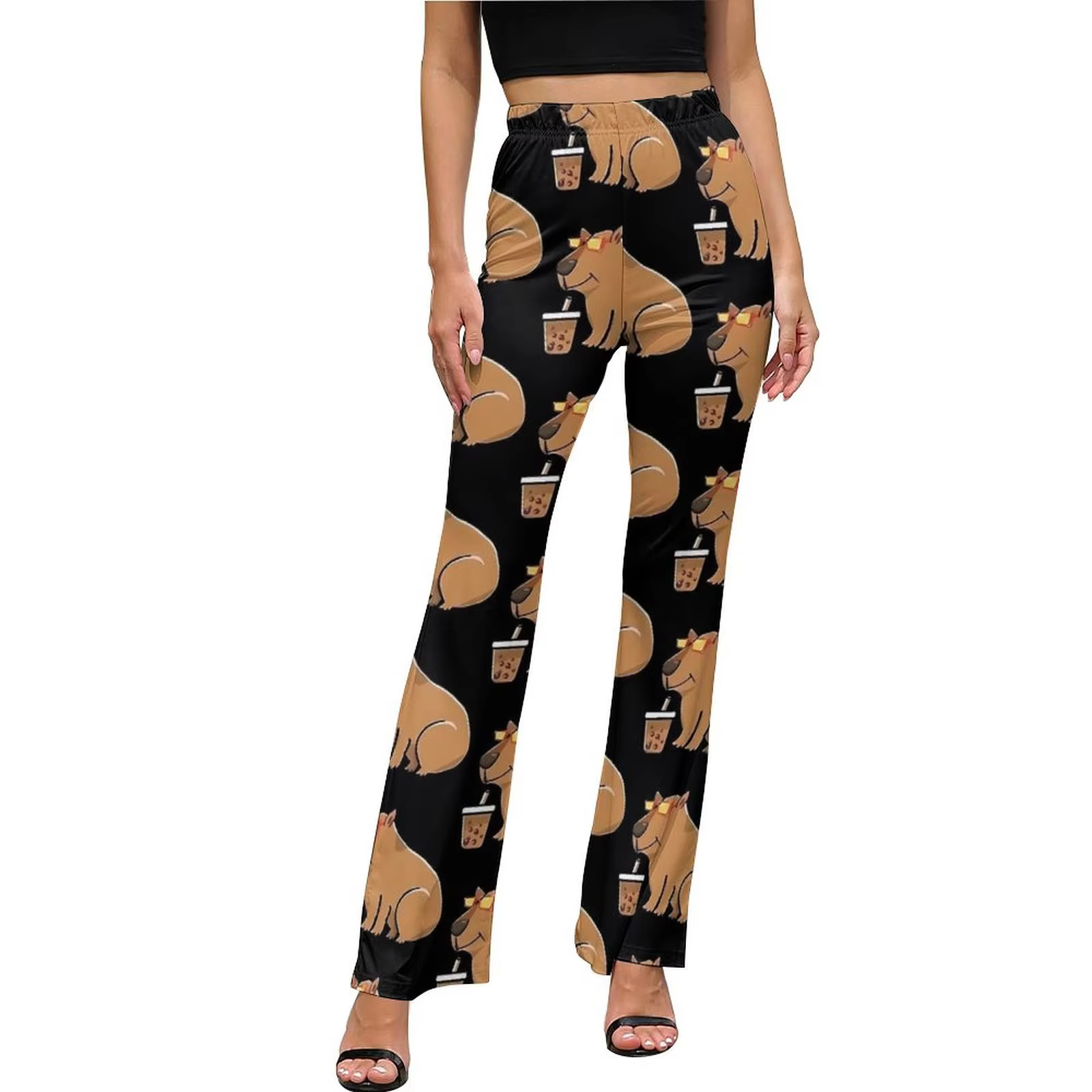 High Waisted Harajuku Flared Trousers, Summertime Sexy, Adorable Capybara Boba with Bubble Tea Pants and Sunglasses
