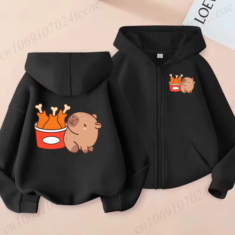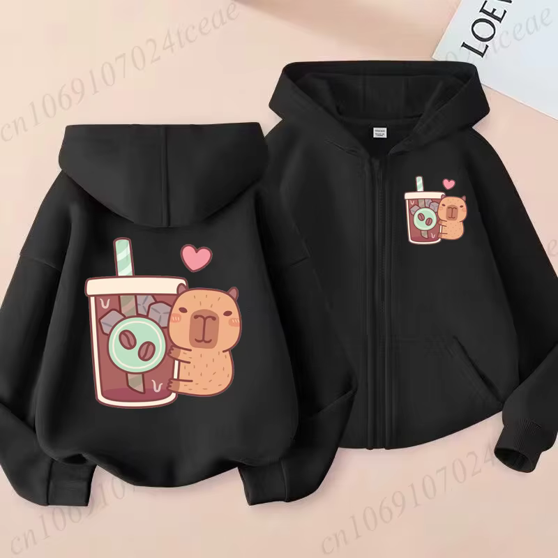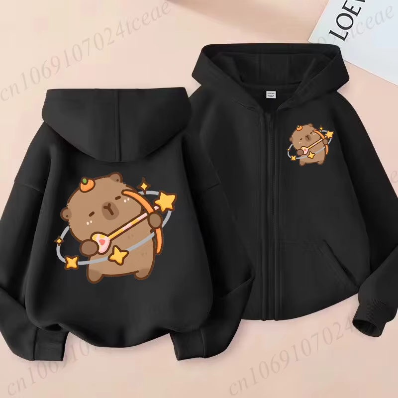 The full-length zipper allows for easy dressing and perfect ventilation. Styled like a classic hoodie but with a full zippered front, this unconventional number fuses the worlds of Mash Up and Capybara Manga Clothing and adds an extra flourish — a unique print of the fuzzy fellows at the center of Kawaii love taking up the entire front or over the arms. Ideal gifts for kids who scream in excitement at the the mention of cool capybaras, this hoodie is the epitome of new kawaii flair.