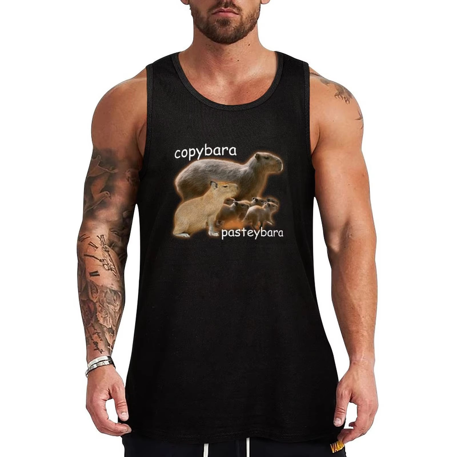 This tanktop lets you express your hard work in the gym while also showing off your funny side. The capybara memes used, such as the Pasteybara, the relaxed capybara and ultra chill meme capybara will make you smile.