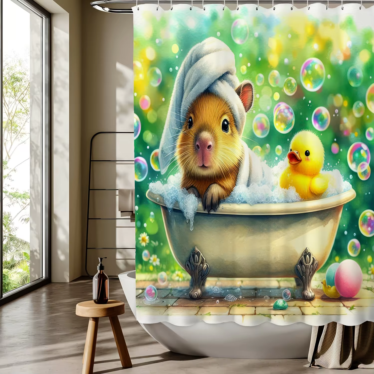 Made of 100% polyester and durable, machine washable with a delightful capybara cartoon design, this curtain is a fun and cozy addition to your bathroom and powder room throughout the season.