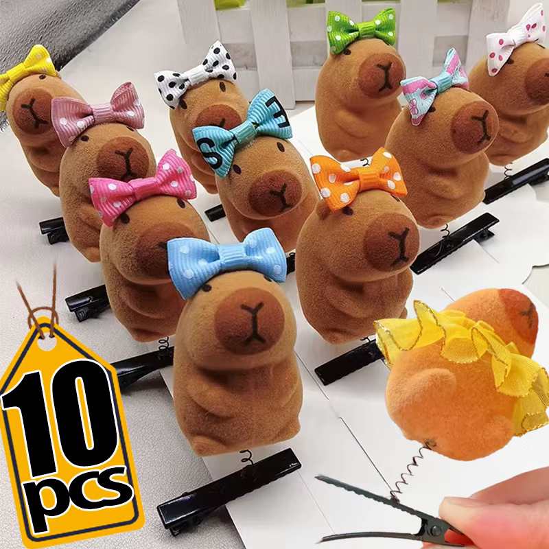 These Kawaii Bow 3D Capybara Plush Hairpins set adds extra fun to any hairstyle! Cute animal themed duckbill clips set of 5 or set of 10 feature fluffy plush capybaras with bright bows and are perfect for adding a whimsical touch to any outfit.